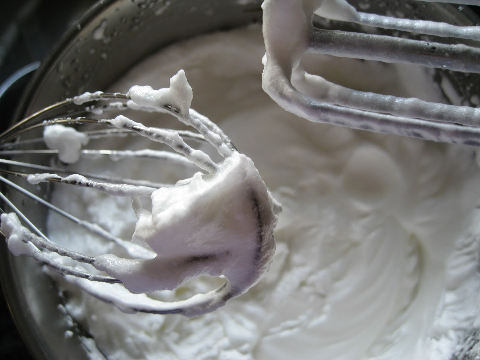 9. 糖水煮好後以線狀的方式慢慢倒入蛋白霜中,同時打蛋器用高速繼續打發蛋白霜,直到蛋白霜尾端挺立。(倒入糖水的速度一定要慢,否則蛋白霜會凝結不均勻)